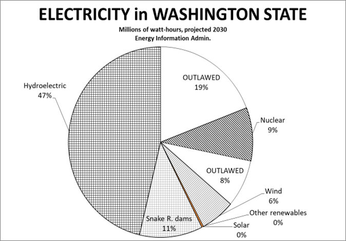 - Twenty-seven percent (27%) of Washington's electricity is outlawed by 2030 (coal, natural gas) and perhaps 11% more will disappear, to a shortfall of 38%, if the four dams on the Snake River are removed. These actions reduce our electricity supply to 62% from the level today.